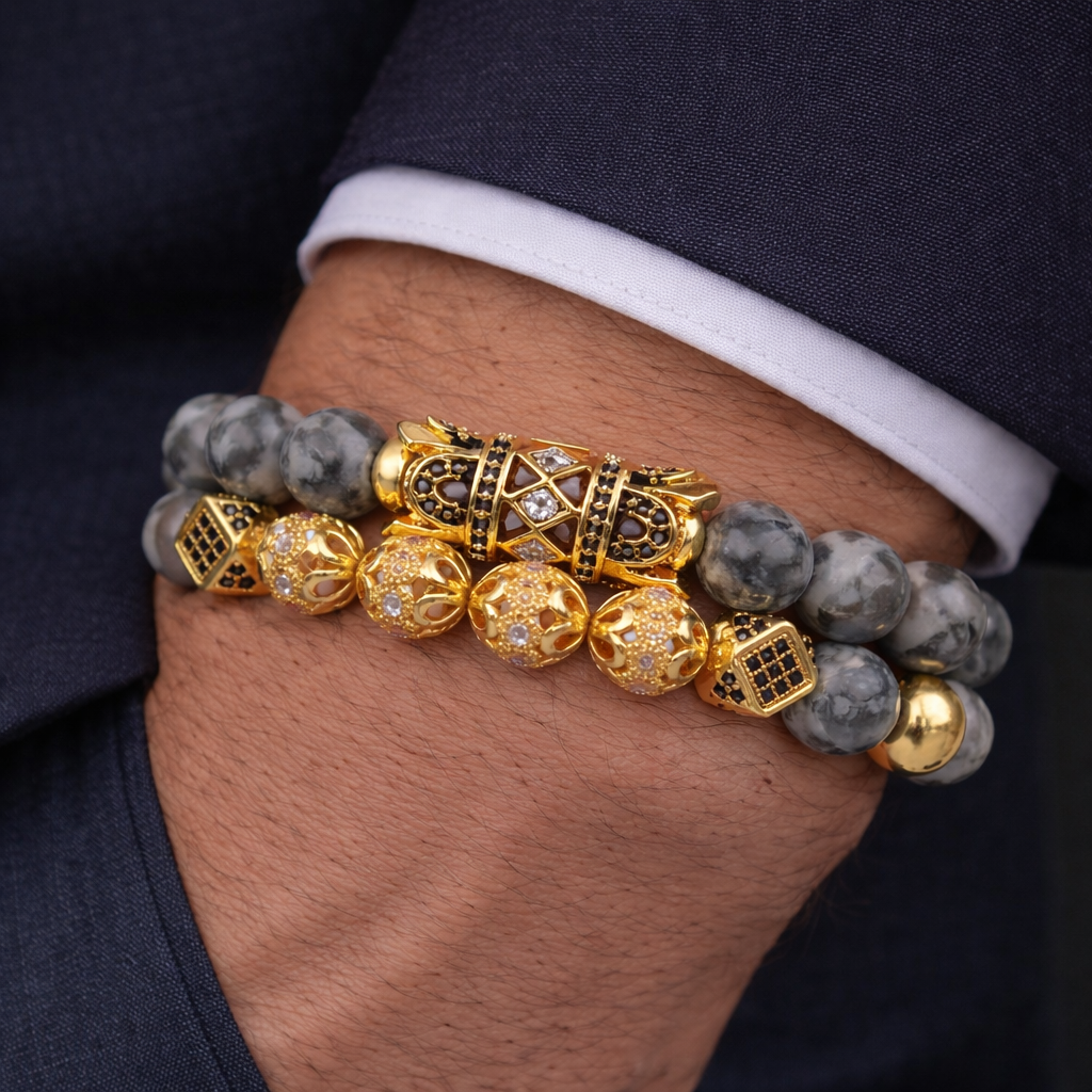 - 1 x Grey Marble Beaded Bracelet with a Gold Plated Stainless Steel Viking Decorative Bead