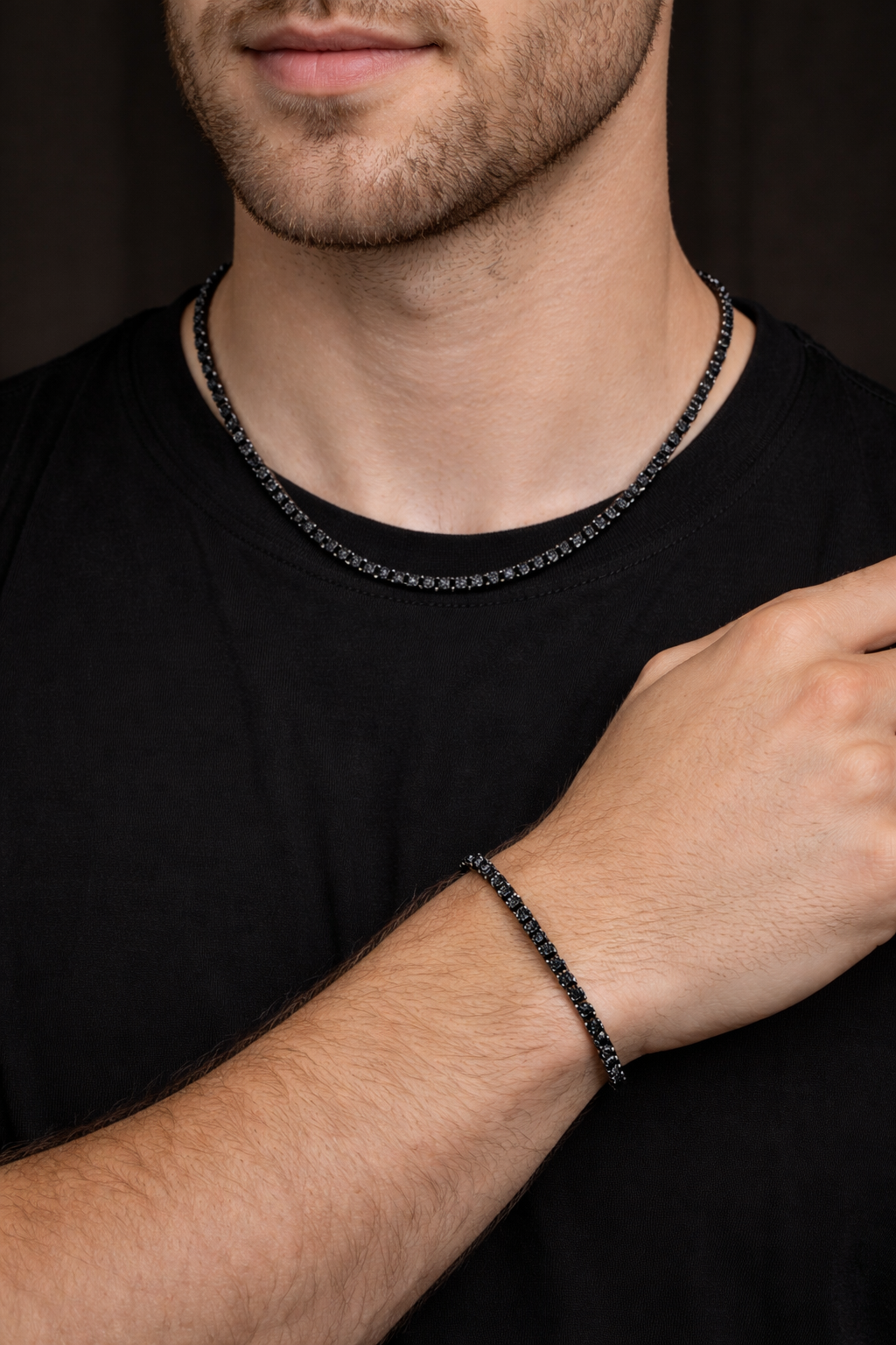 The Obsidian Tennis Set is designed for the modern gentleman who values understated luxury with maximum impact. Crafted from high-quality stainless steel, this matching black tennis necklace and bracelet set features precision-cut black crystal zirconia stones, delivering a refined shine with a bold, masculine edge.